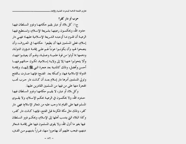 Semua negara yang para pemimpinnya menjadikan hukum Allah sebagai aturan dan menerapkan syariat Islam pada rakyatnya, di mana rakyatnya mampu untuk melaksanakan kewajiban-kewajiban syariat Islam, maka itu adalah negara Islam. Kaum Muslimin yang tinggal di negara tersebut harus menaati para pemimpinnya dalam kebaikan, memberikan masukan pada pemerintah, membantu dalam pelaksanaan kebijakan negara , dan menyokongnya dengan intelektualitas dan aksi nyata. Hendaknya mereka tetap tinggal di negara tersebut dan tidak pindah, kecuali ke negara Islam lainnya yang dapat menjamin kondisi mereka lebih baik jika berada di sana. Itu seperti Madinah setelah Nabi Shallallahu ‘Alaihi wa Sallam hijrah dan mendirikan negara Islam di sana, juga seperti Makkah setelah ditaklukkan. Sebab, setelah ditaklukkan dan dipimpin oleh kaum Muslimin, Makkah menjadi wilayah Islam, di mana sebelumnya merupakan kawasan perang yang harus ditinggalkan oleh penduduk Muslim di sana yang mampu melakukannya.