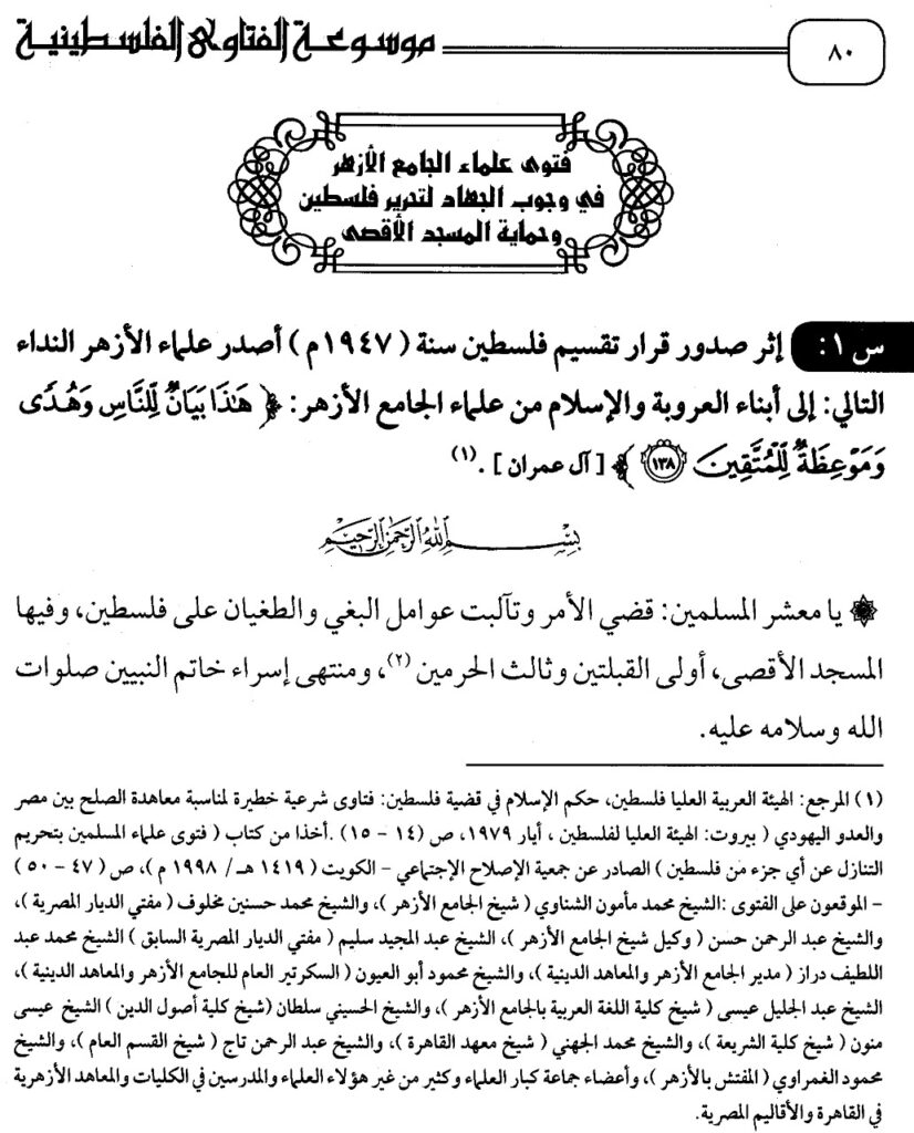 Permasalahan: Setelah dikeluarkan keputusan pembagian Palestina pada tahun (1947 M), para ulama Al-Azhar mengeluarkan seruan berikut: