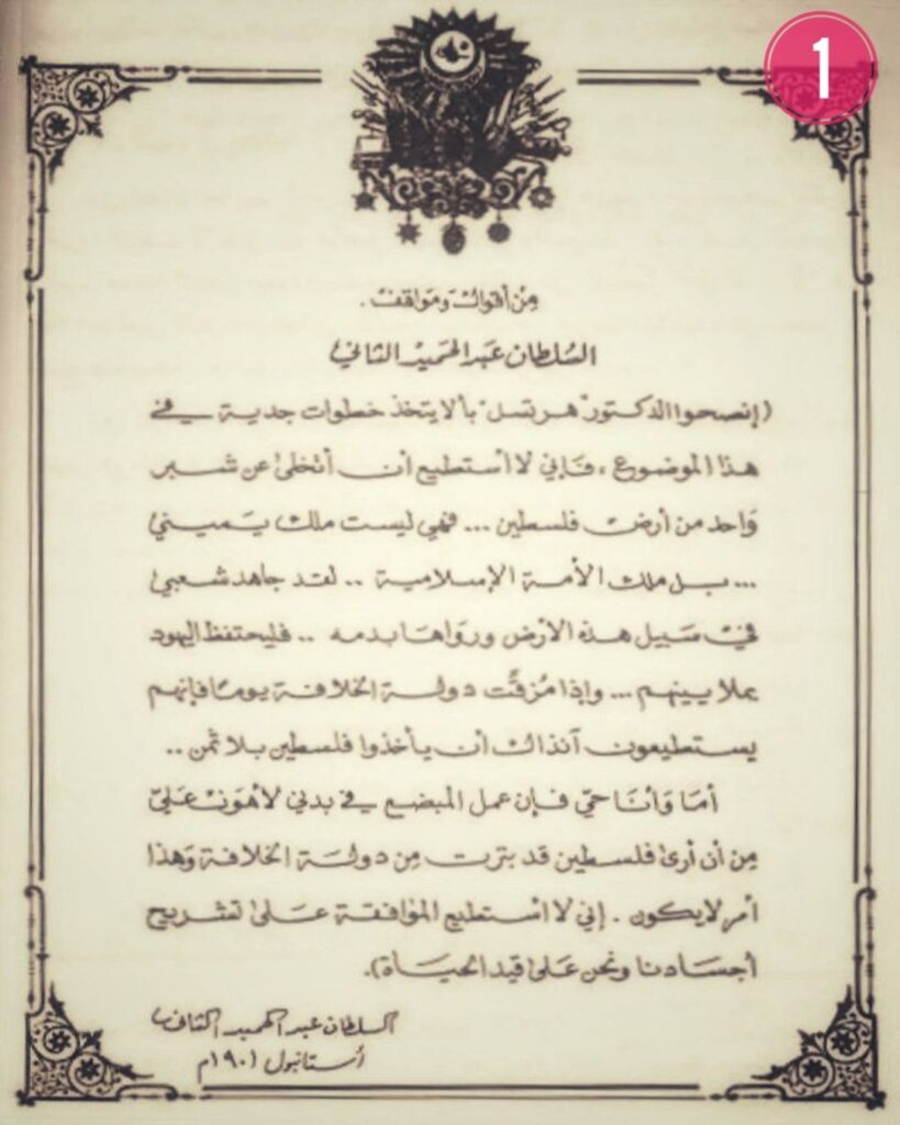 “Jika Tn Herzl adalah teman anda sebagaimana anda adalah teman saya, maka nasihatilah ia untuk tidak melangkah lebih jauh lagi dalam urusan ini. Saya tidak mungkin menjual (Palestina) walau hanya sejengkal pun, karena tanah itu bukan milik saya, melainkan milik kaum saya (Muslimīn). Kaum saya (Muslimīn) telah membangun Kekaisaran ini dengan darah mereka dan menyuburkannya dengan darah mereka. Kami akan kembali menumpahkan darah kami di atasnya sebelum kami membiarkannya direnggut dari tangan kami.”2